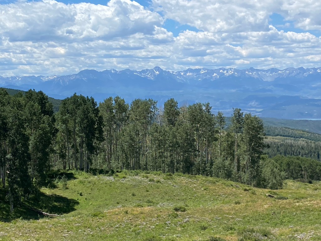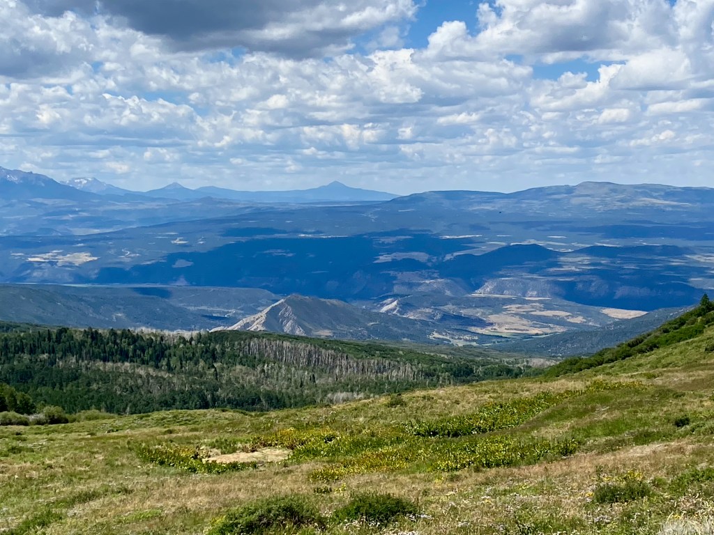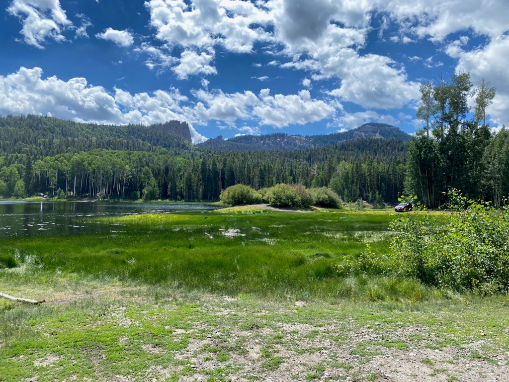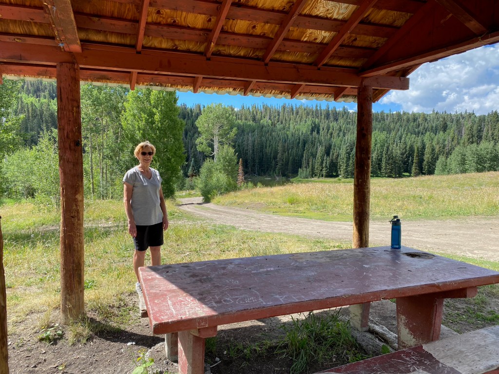 There are two small lakes, a bunch of picnic tables and some fine views of the Uncompahgre River valley and the San Juans. People do fish there, but we had gone to check it out, have a picnic, and get away from the heat in the valley. Once you reach the park there is a maze of old roads, many of which require 4WD vehicles, but just about any car can make it to the park. Our Subaru had no problems, although the last three miles were rocky, bumpy, and the road was narrow. Not quite 4WD territory but slow-driving for certain.
