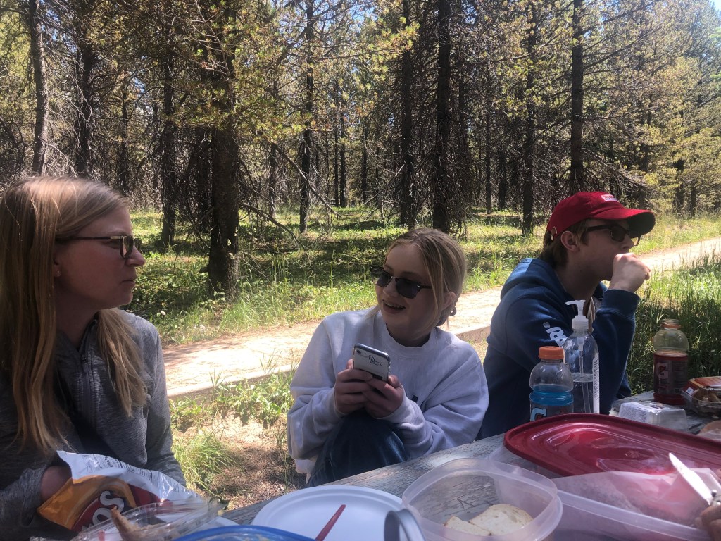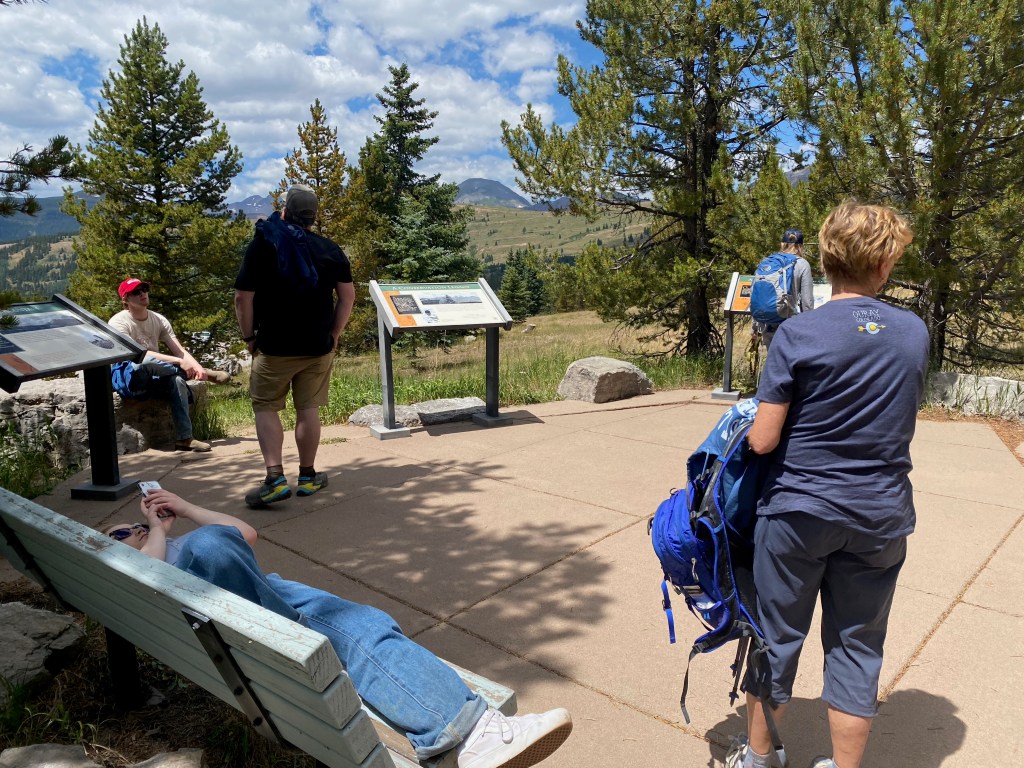 It’s a pretty little body of water formed by an earthen dam put up some sixty years ago. The views of the mountains on all sides are beautiful. We ate a simple picnic lunch and then did the 0.8 mile walk around the lake itself. Cool temperatures up there at 10,750 feet, with no flying/biting nasties to spoil the day.