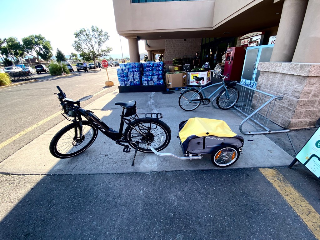 From time to time I’ve mentioned bringing home the groceries via bicycle. If it’s just a few items, I will use panniers (saddlebags). But when it’s a full-bore trip I fall back on my trusty Burley Nomad cargo trailer.