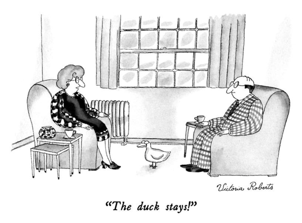 In keeping with the theme of this post, which is ducks of various stripes, I searched the cartoon archives of the New Yorker for “ducks,” and one of those that came up in the search was this one. Now a staple of the thinking of New Yorkers is that the rest of the country, especially the Midwest, consists of a population of buffoons residing in a land that nobody important wants to live in.