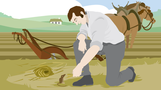 To A Mouse depicts Burns’ remorse at having destroyed the nest of a tiny field mouse with his plough. He apologises to the mouse for his mishap, for the general tyranny of man in nature and reflects mournfully on the role of fate in the life of every creature, including himself.