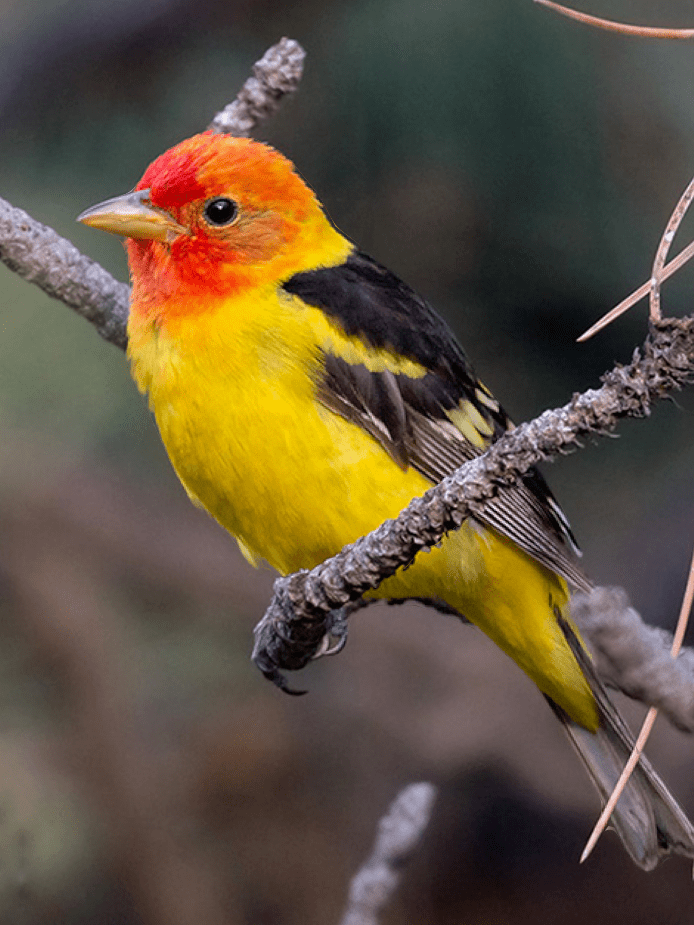 There’s only one bird that I know of locally that fits both of those observations – the beautiful Western Tanager. They are smallish, about the size of a red-winged blackbird.