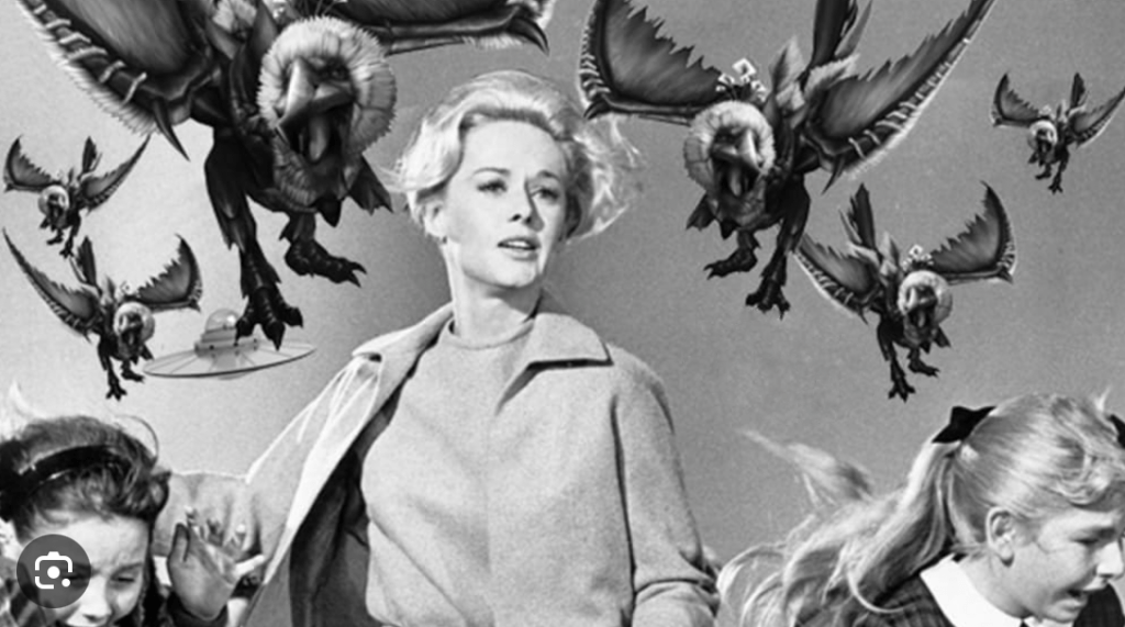 The Birds, for younger readers, was a film where the ornithologic fauna of a small seaside town turned on the humans, pecking them in all sorts of horrible ways (the eyes … why did they go for the eyes?). While being pursued by murderous titmice wouldn’t be too scary, when the bird in question is the size of a big seagull or raven, the grim possibilities were more obvious.
