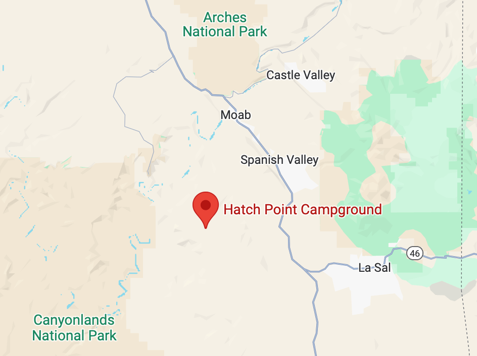 Our first campout of the year, and we’re meeting Amy, Neil, and Claire at Hatch Point Campground in Utah. It’s located about an hour’s drive south of Moab. This same group camped there once before, in 2019, except that Aiden was with us back then. At present Aiden is frittering away his life at college in Austin TX. God knows what they are putting in his head.