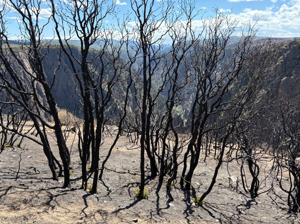 I visited the Black Canyon Park on Monday forenoon. It is only partially open, and there is no walking about in the burned areas at all, anywhere, said the burly Park Ranger to me as I came strolling back down a charred hummock. He also said that my hiking where I had no business being would encourage all the other people who were presently in that same parking lot to start doing it. And he definitely implied that this could be the end of civilization as we know it.