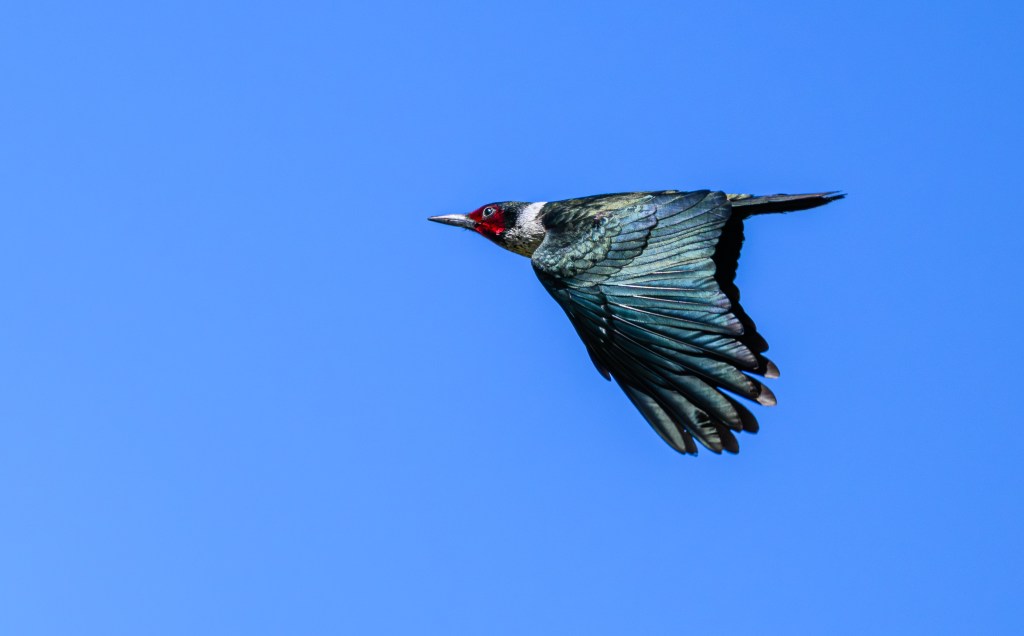 The Lewis’s Woodpecker might have woodpecker in its name, but it forages like a flycatcher and flies like a crow. It has a color palette all its own, with a pink belly, gray collar, and dark green back unlike any other member of its family. From bare branches and posts, it grabs insects in midair, flying with slow and deep wingbeats. It calls open pine forests, woodlands, and burned forests home, but it often wanders around nomadically outside of the breeding season in search of nuts.