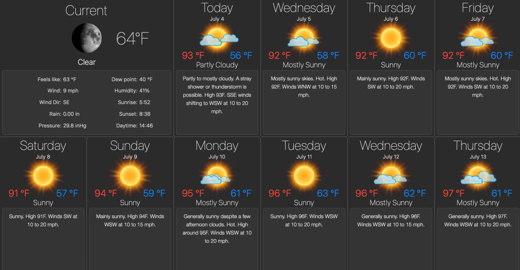 I don’t know if you have noticed, but it is quite warm out there in the land beyond the front door. Our ten day forecast here in Paradise goes like this: