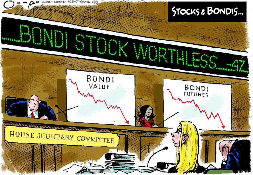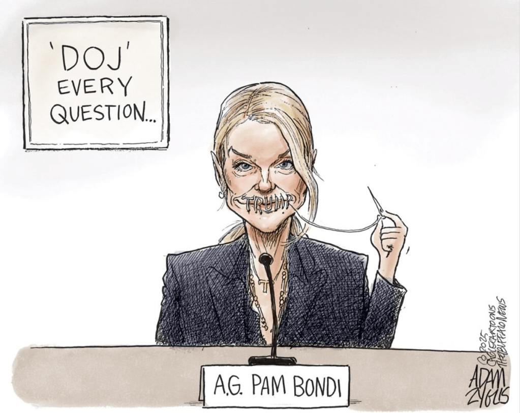 Quite a performance by Pam Bondi at the recent congressional hearing. In several hours she failed to answer a single question, but instead behaved much like a cat caught in a gopher trap. Snarling and spitting and hurling invectives at all within earshot … I made a promise to myself to stay out of courtrooms altogether until she is safely in Hell.