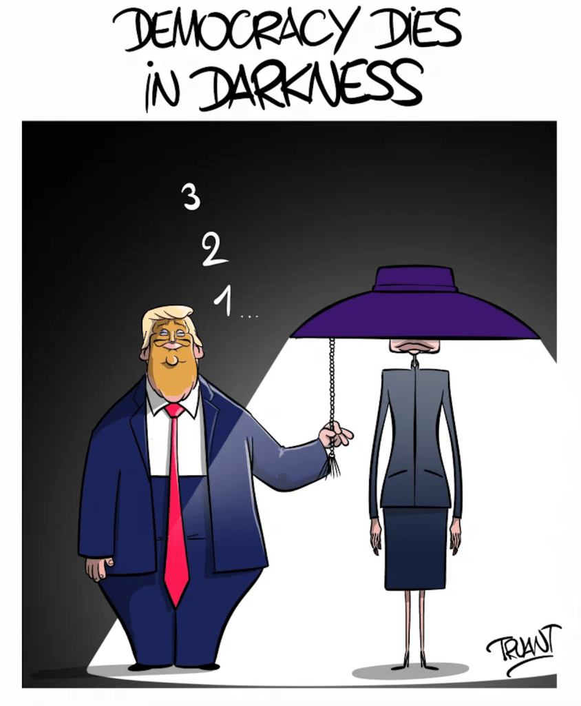 The artist has incorporated images of a family moving cautiously within the wings.